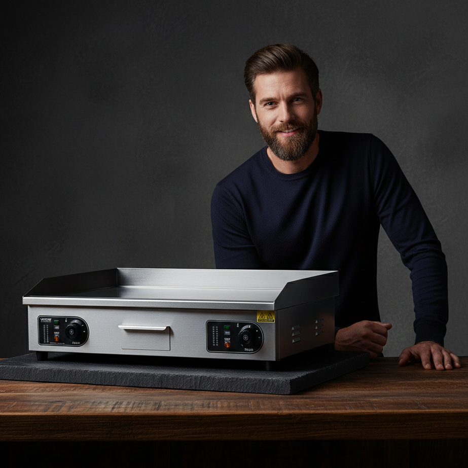 Retrouvez la précision d'une cuisine de grand restaurant dans votre propre cuisine. Sa surface en inox de qualité alimentaire monte en température de façon homogène — pour saisir, snacker et caraméliser vos ingrédients avec une maîtrise parfaite. Idéal pour 2 à 8 personnes.